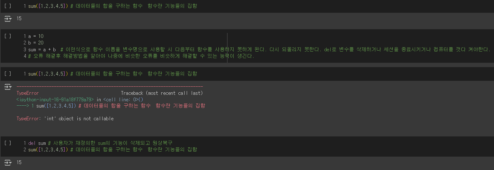 실수로 파이썬 자체 함수(ex. sum, max, min 등)을 변수명으로 사용하여 파이썬 함수 기능에 덮어씌어져 기능을 못할때 del을 사용해 변수를 지워주면 원래 함수 기능이 돌아옵니다. 최대한 저러한 실수는 하지 않는것이 좋지만 세션을 초기화 하지 않아도 되돌릴 수 있는 방법을 알았습니다.