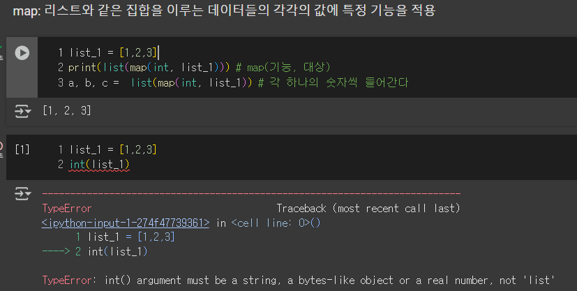 map 함수 입니다. 리스트 같은 집합 변수에 특정 함수 및 기능을 각각의 값에 적용하게 하는 함수입니다. int()와 같은 str데이터에만 사용 할 수 있는 함수를 list타입 변수속 각 데이터에 적용하여 가능하게끔 합니다.