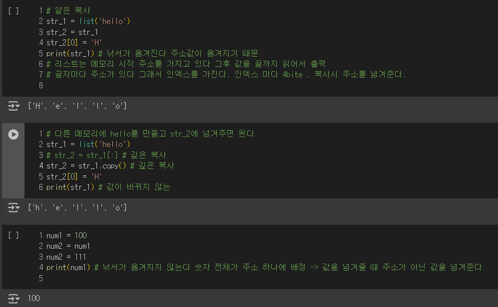 str_2 = str_1 와 같이 문자열은 그대로 옮겨주면 값이 아닌 주소값을 넘겨주어 얕은 복사가 됩니다. --> str_2 값이 변경되면 str_1의 값도 변경이 됩니다. --> 데이터 손상 가능