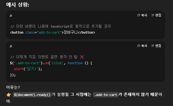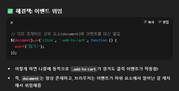 위와 같이 버튼이 나중에 동작하는 경우 .add-to-cart가 없어 이벤트가 동작하지 않습니다. 이를 해결하기 위해 이벤트를 위임 합니다.