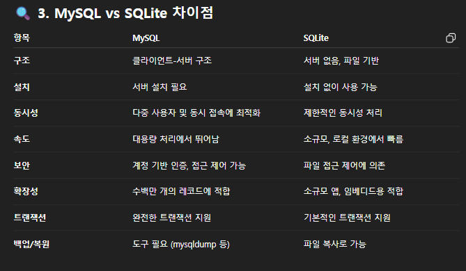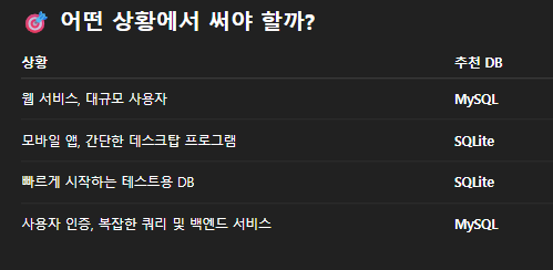 차이점은 위 사진과 같습니다. SQLite는 이름에서 알 수 있듯이 작고 라이트한 버젼의 MYSQl입니다. 소규모 프로젝트 혹은 테스트에서 용이할거 같습니다.