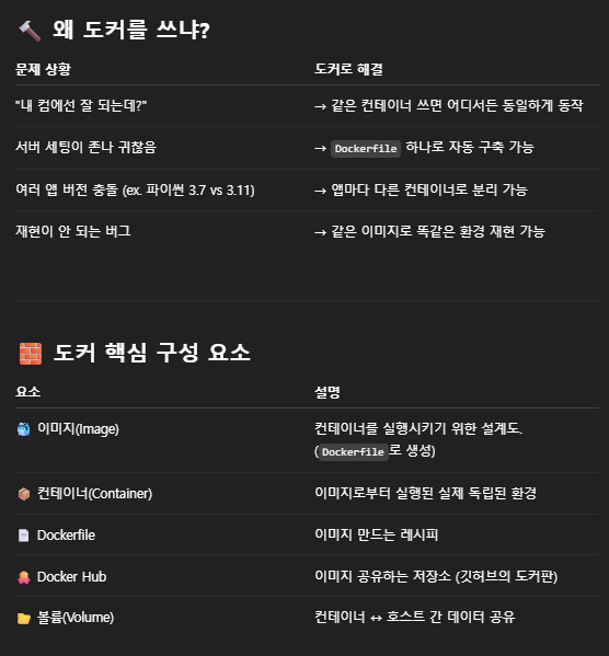 도커란 '컨테이너'라는 기술을 담아서 격리된 환경에서 실행시키는 도구입니다. 즉 자신의 개발환경을 통째로 다른사람에게 던져주는 것입니다. 여기에는 OS설정부터 라이브러리를 모두 포함합니다. 그래서 그냥 파일(이미지(사진은 아님))를 받고 실행하면 바로 실행이 되는 겁니다.