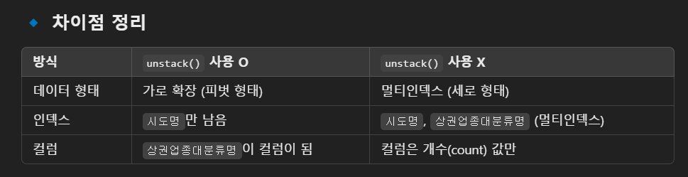 unstack을 사용하면 인덱스에 첫번째 인자가 컬럼에 두번째 인자가 나오며 좀 퍼져 나오게 됩니다. 사용하지 않을경우 인덱스에 둘다 들어가면 값은 count 값이 나오게 됩니다.