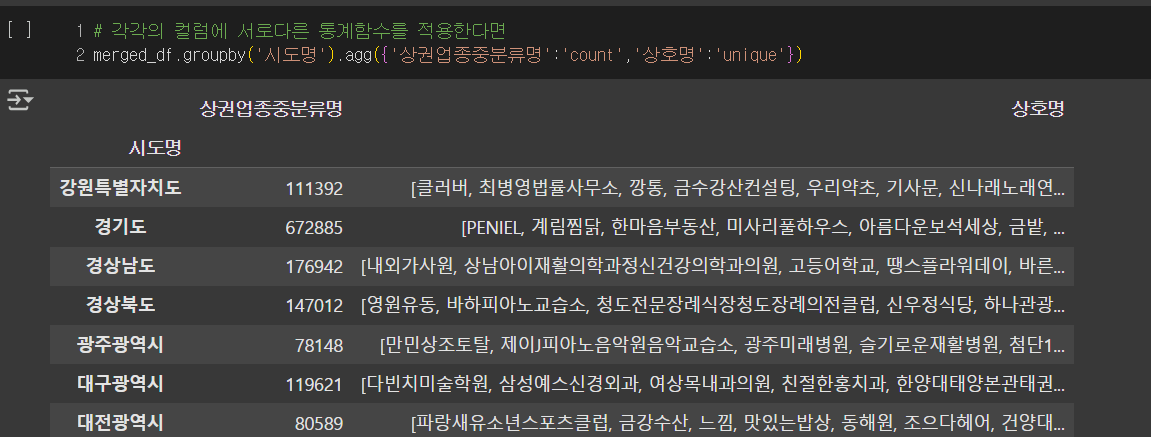 상권없종중분류명에는 count 함수를 상호명에는 unique 함수를 적용하여 출력합니다.