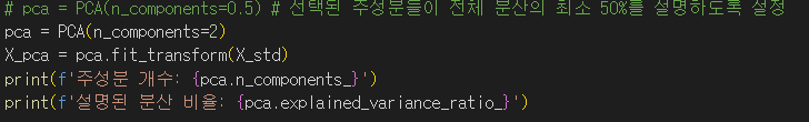 pca는 주성분 분석을 하기 위해 사용하는 라이브러리로 데이터가 많고 복잡하면 그중 핵심 특징만 뽑아 단순화 하는 기능을 합니다. 위는 n_components를 2로 설정하여 2개의 주성분만 뽑는 코드입니다. 차원을 축소한 후 복구하면 노이즈를 제거하는 효과도 볼 수 있습니다.