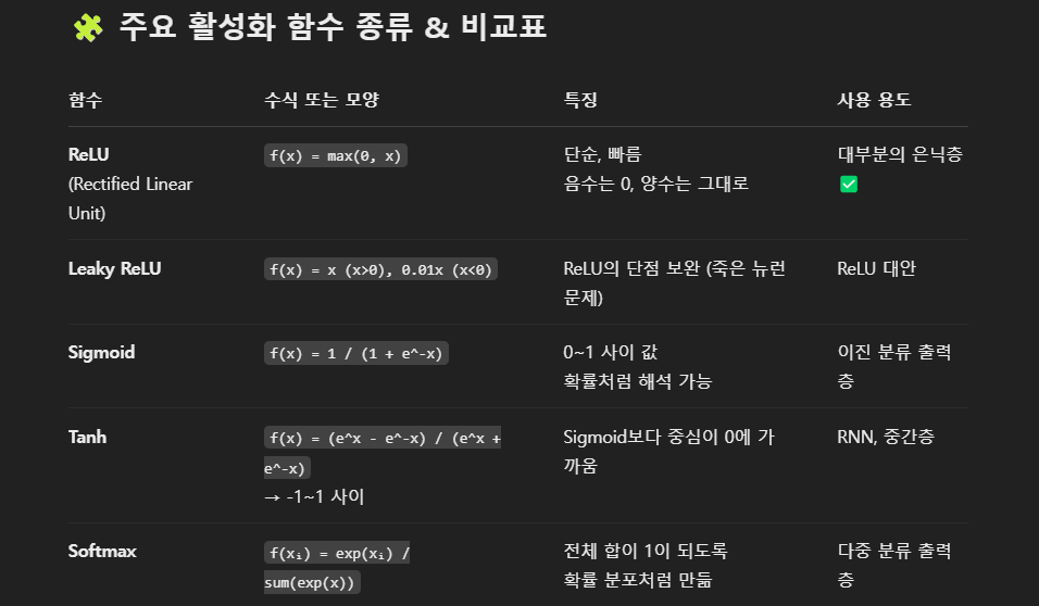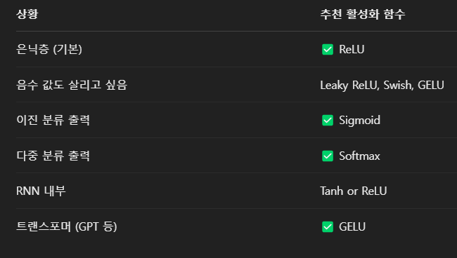 활성화 함수의 종류와 계산식, 사용방법은 위 사진과 같습니다.