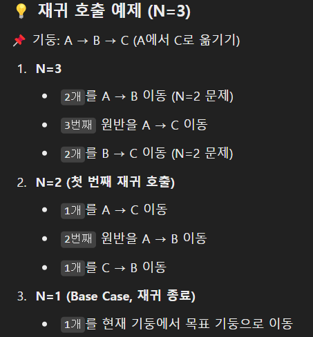 위와 같은 재귀 패턴 찾기 입니다. n개의 이동 방식은 n-1개 이동 -> 타겟 원판 이동 n-1개 원판 이동 입니다. 이를 재귀를 표현하는것이 해결 방법 입니다.