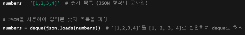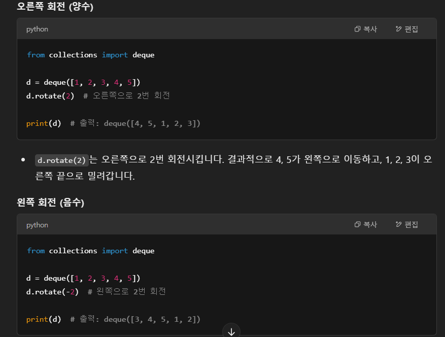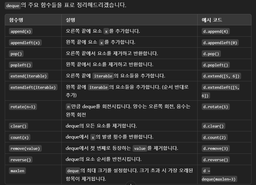 from collections import deque 을 한 후 사영할 수 있으며 사용 가능한 함수는 다음과 같습니다.