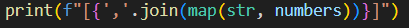 [1, 2, 3, 5, 8] 이런식의 출력을 공백 없이 [1,2,3,5,8]로 출력하는 방법입니다. deque 타입에 정수가 들어있는 number데이터에 map함수를 적용해 str문자열로 변경시킨 후 ,f로 조인을 합니다. 그러하면 1,2,3,5,8이 나옵니다. 그 후 f-string 으로 밖에 []대괄호를 씌우는 방법입니다.