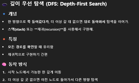 반면 DFS는 Depth-First Search 로 깊이를 우선적으로 탐색하는 방식입니다.