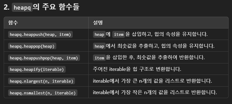 import heapq를 하면 사용할 수 있으며 값이 작은 값부터 처리하기 위해 사용하는 라이브러리 입니다.