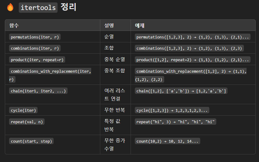 from itertools import * 로 사용할 수 있습니다. 여러 경우의 수와 수열을 구할때 매우 유요하여 코딩테스트에 많이 나온다고 합니다. 함수는 다음과 같습니다.